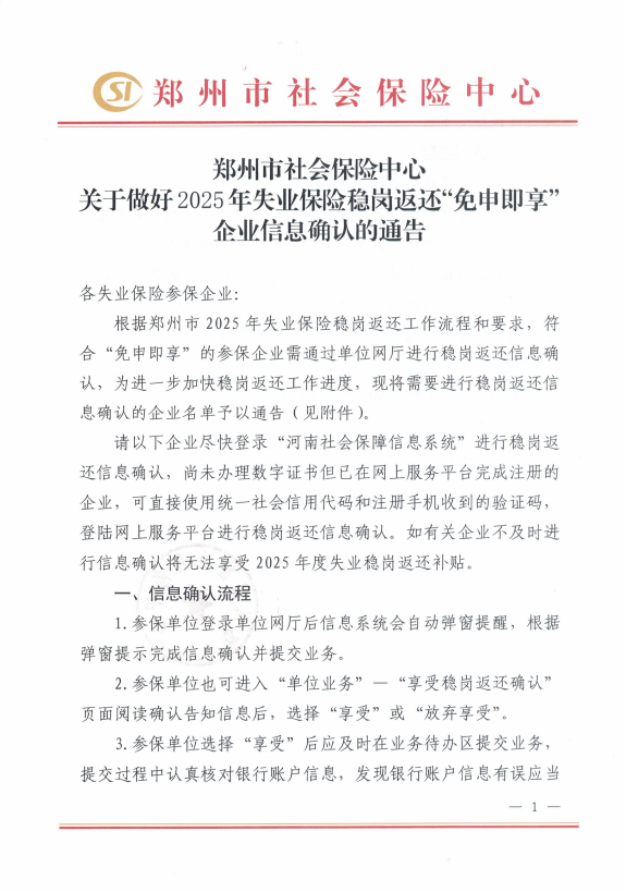 郑州市社会保险中心关于做好2025年失业保险稳岗返还“免申即享’企业信息确认的通告
