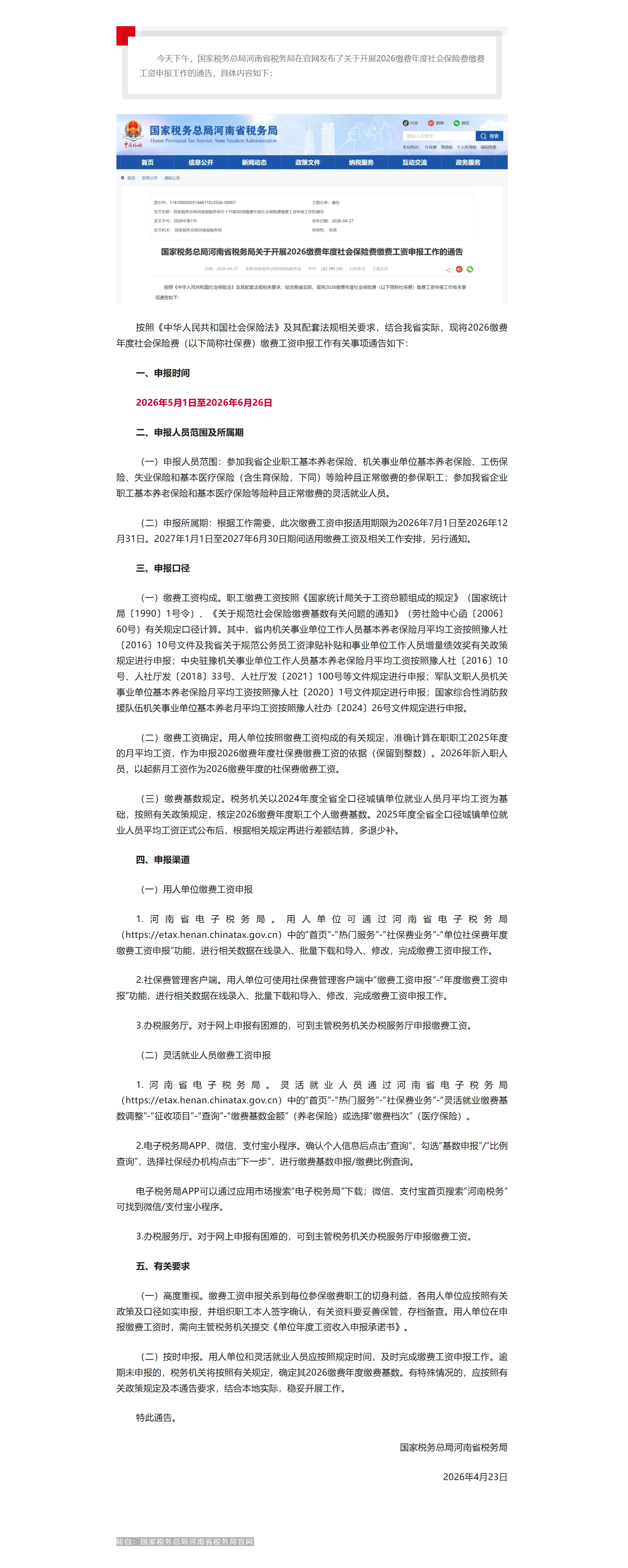 国家税务总局河南省税务局关于开展2026缴费年度社会保险费缴费工资申报工作的通告