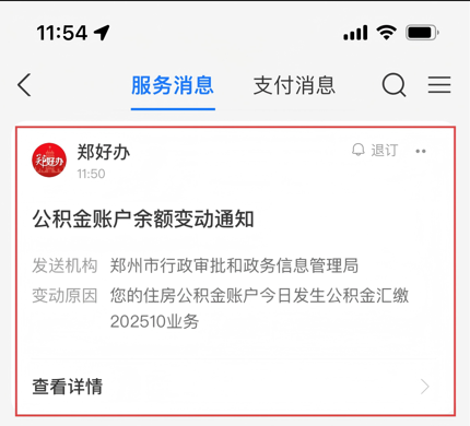 为进一步提升住房公积金服务便民化、智能化水平,郑州住房公积金管理中心创新服务模式,即日起,已在“支付宝”与“郑好办”双平台完成个人实名认证的郑州住房公积金缴存职工,可通过“支付宝”服务消息中心接收个人公积金账户变动提醒。