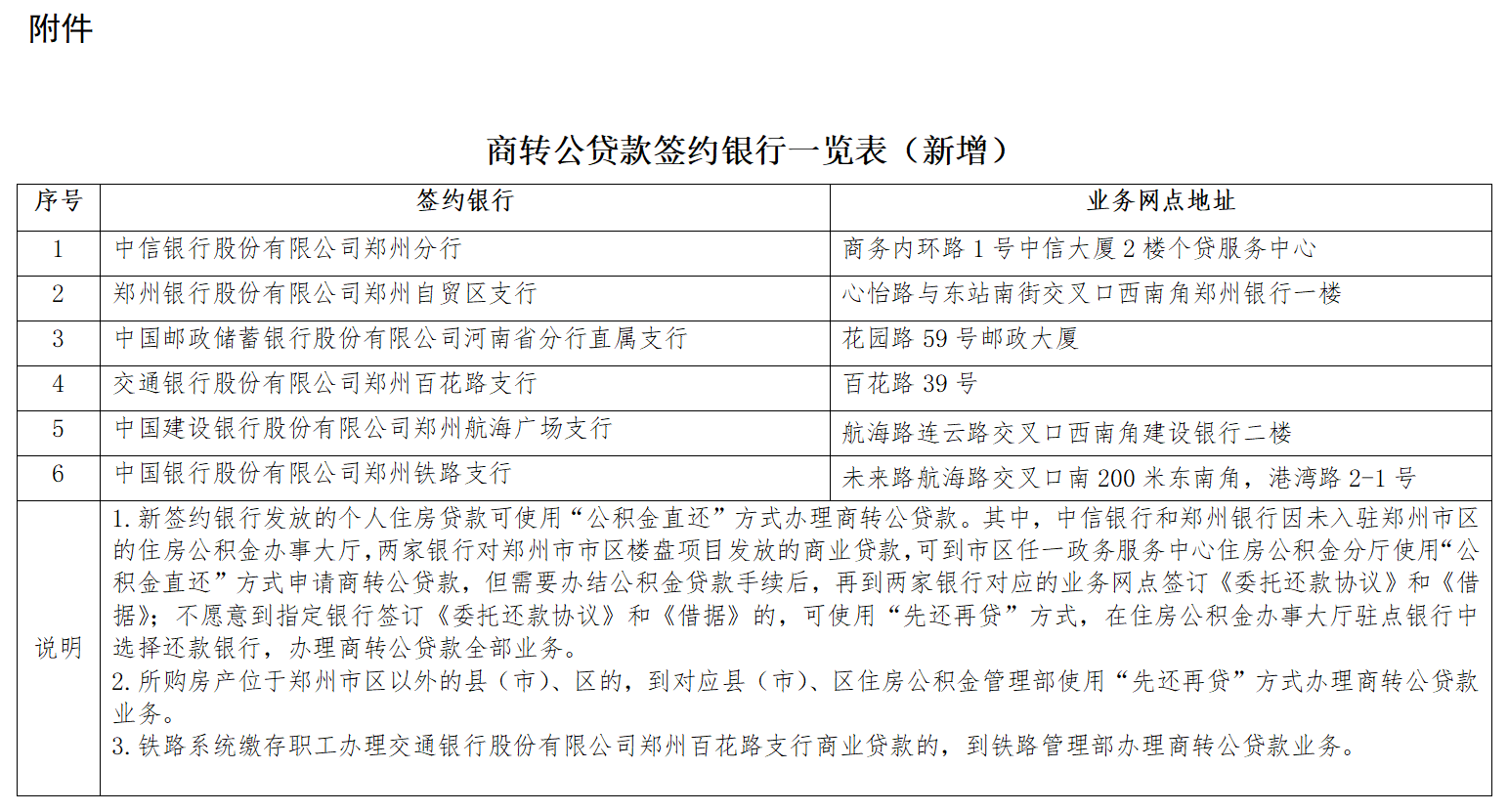 根据《郑州住房公积金管理中心关于商业银行个人住房贷款转住房公积金个人住房贷款有关事项的通知》(郑公积金〔2024〕15号),中信银行股份有限公司郑州分行等6家商业银行(见附件)已与郑州住房公积金管理中心签订了《商转公贷款业务合作协议》,现予以公布。自公布之日起,新增签约银行发放的个人住房贷款,可以使用“公积金直还方式”办理“商转公贷款”业务。