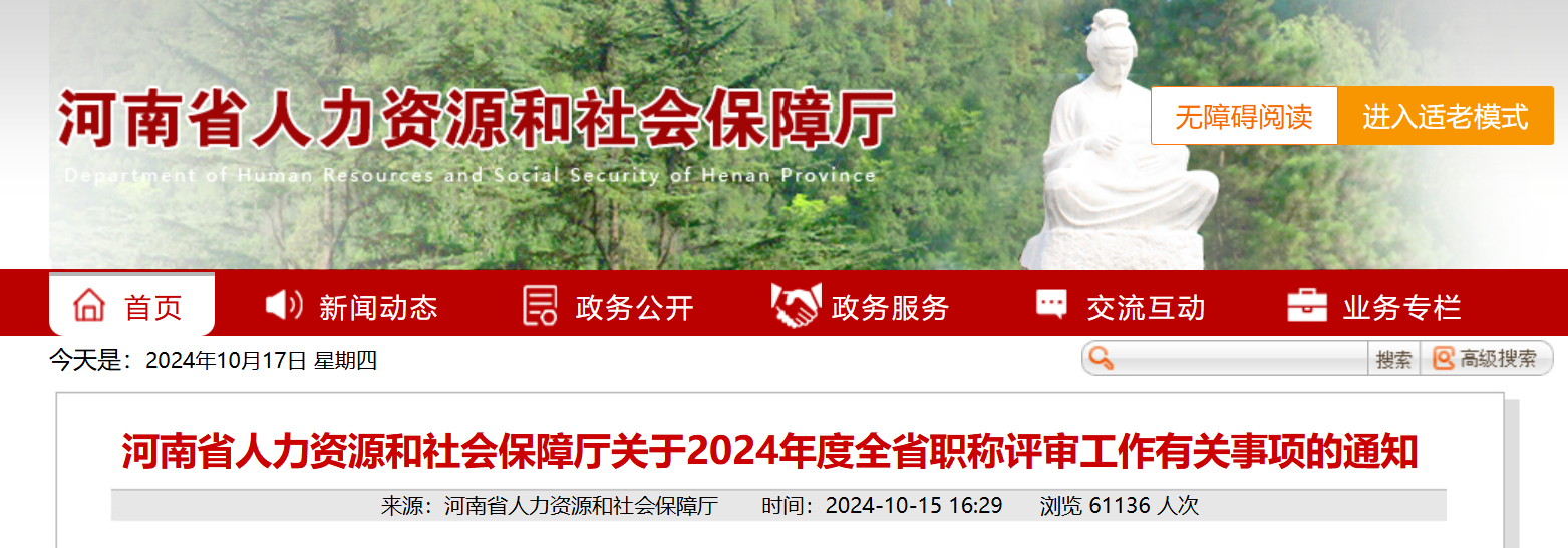 10月15日,河南省人力资源和社会保障厅在官网发布了关于2024年度全省职称评审工作有关事项的通知,具体通知内容如下: