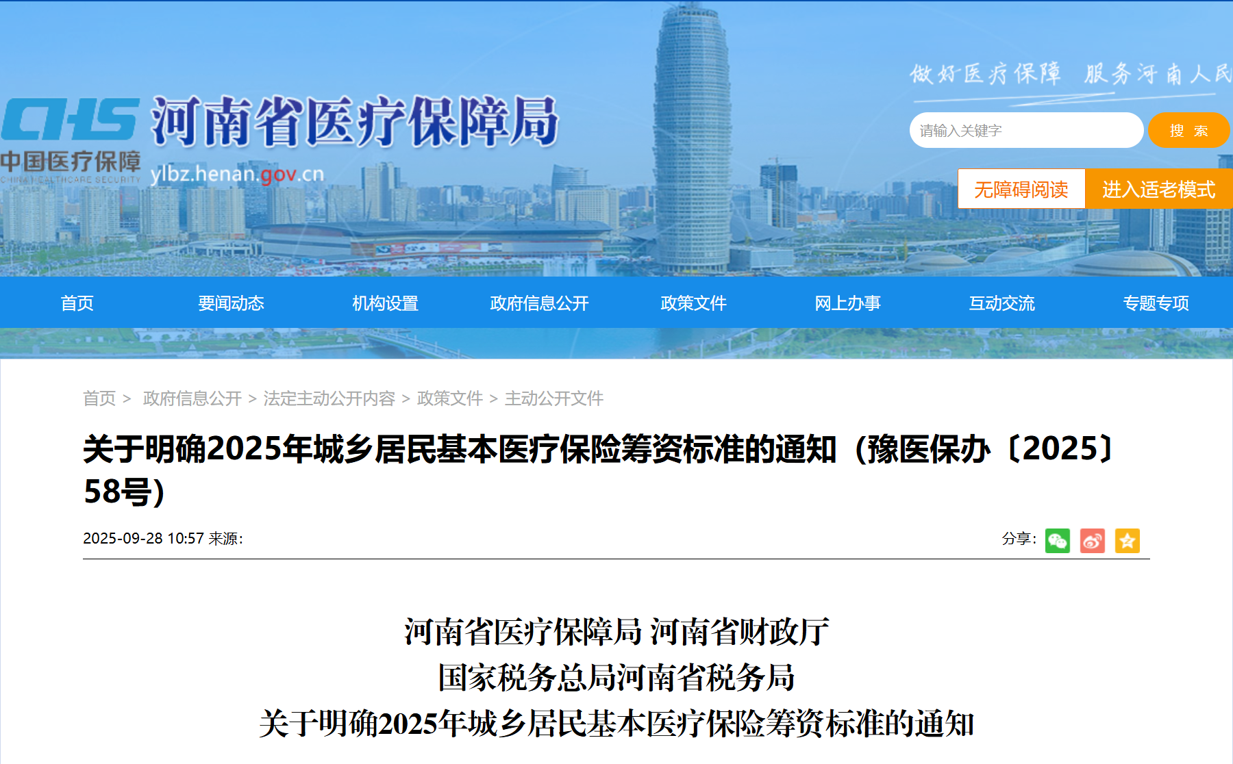 河南省医疗保障局河南省财政厅国家税务总局河南省税务局关于明确2025年城乡居民基本医疗保险筹资标准的通知