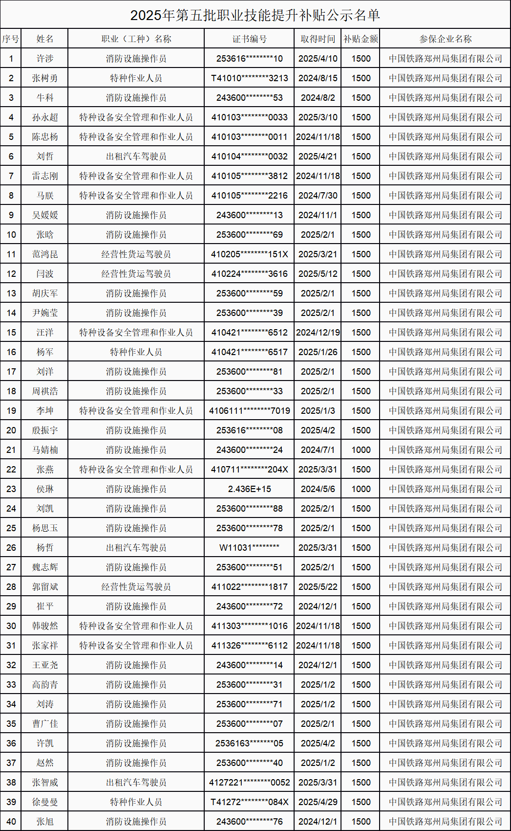 失业保险职业技能提升补贴发放名单公示 (2025年第五批)