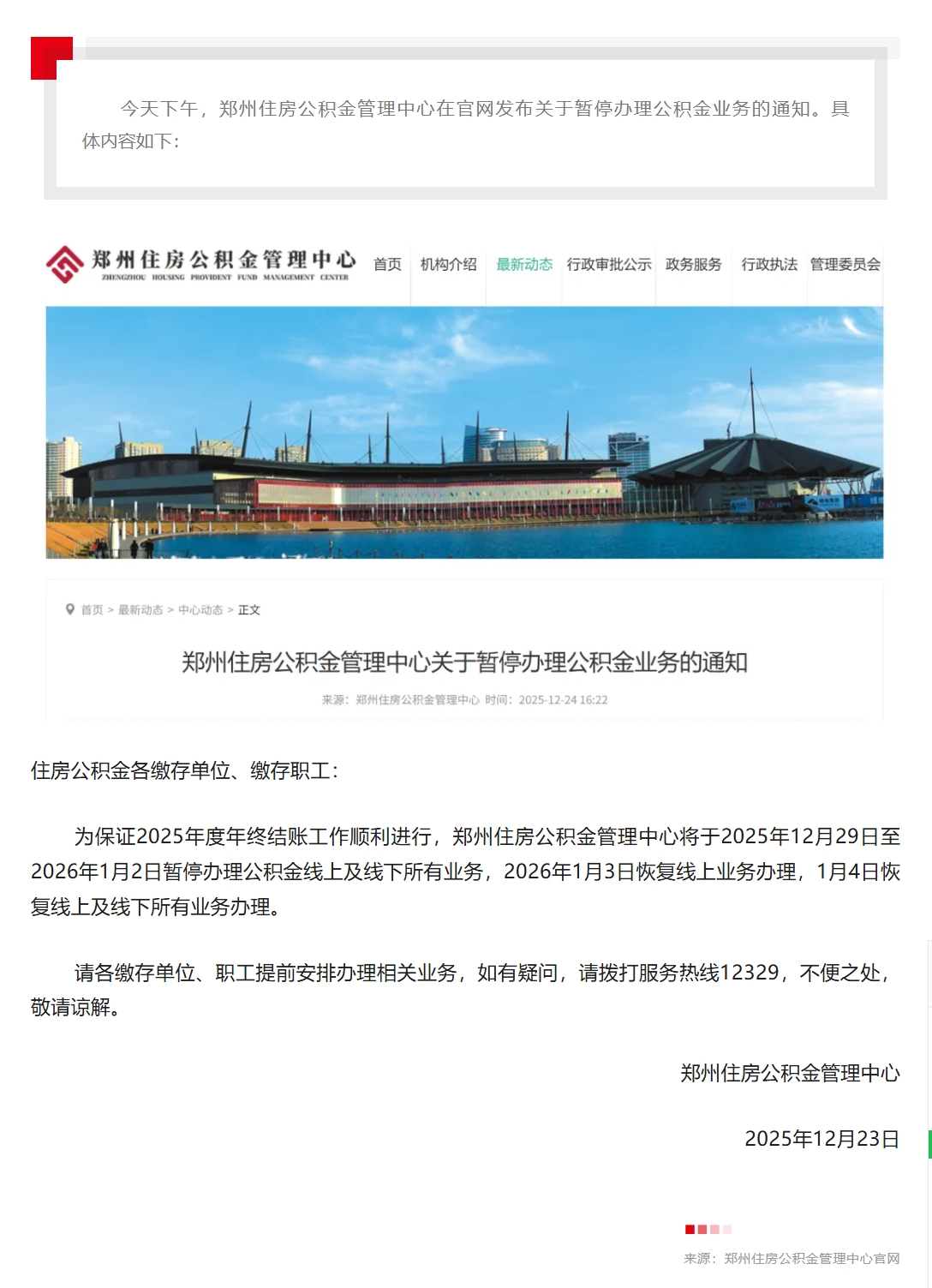 郑州住房公积金管理中心关于暂停办理公积金业务的通知
